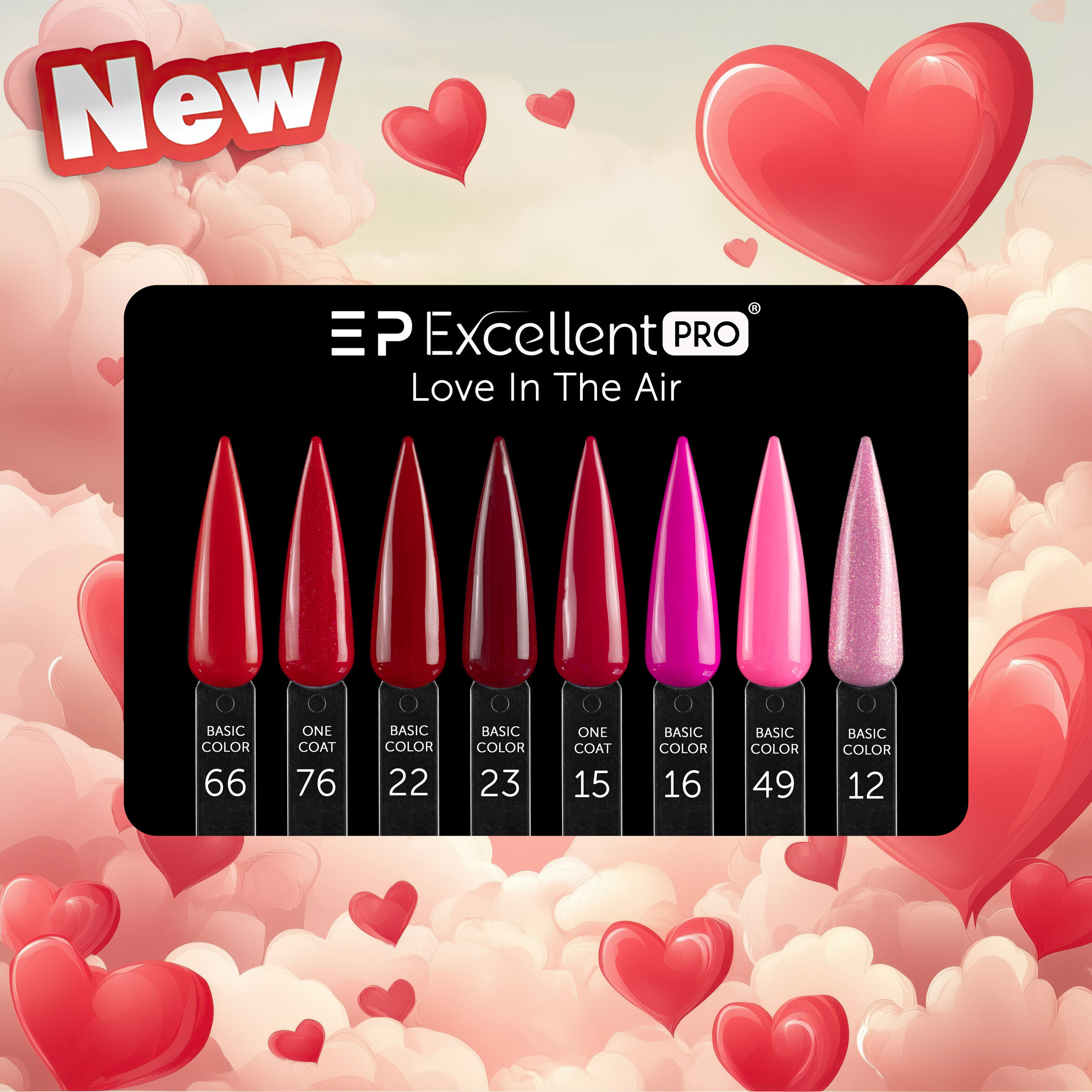 Kolekcja LOVE IN THE AIR Excellent PRO - to osiem absolutnie walentynkowych kolorów wybranych spośród linii Excellent PRO Basic oraz Excellent PRO One Coat. Kolekcja LOVE IN THE AIR to uwodzicielskie czerwienie, intensywne róże i hybrydy z odrobiną błysku, które rozświetlą ten pełen miłości czas. Kolory z tej kolekcji będą idealną propozycją walentynkową a także doskonale sprawdzą się przez cały rok, zachwycając swoją klasyką. Lakiery z linii Basic i One Coat charakteryzują się doskonałym kryciem, średniogęstą konsystencją i świetną trwałością.