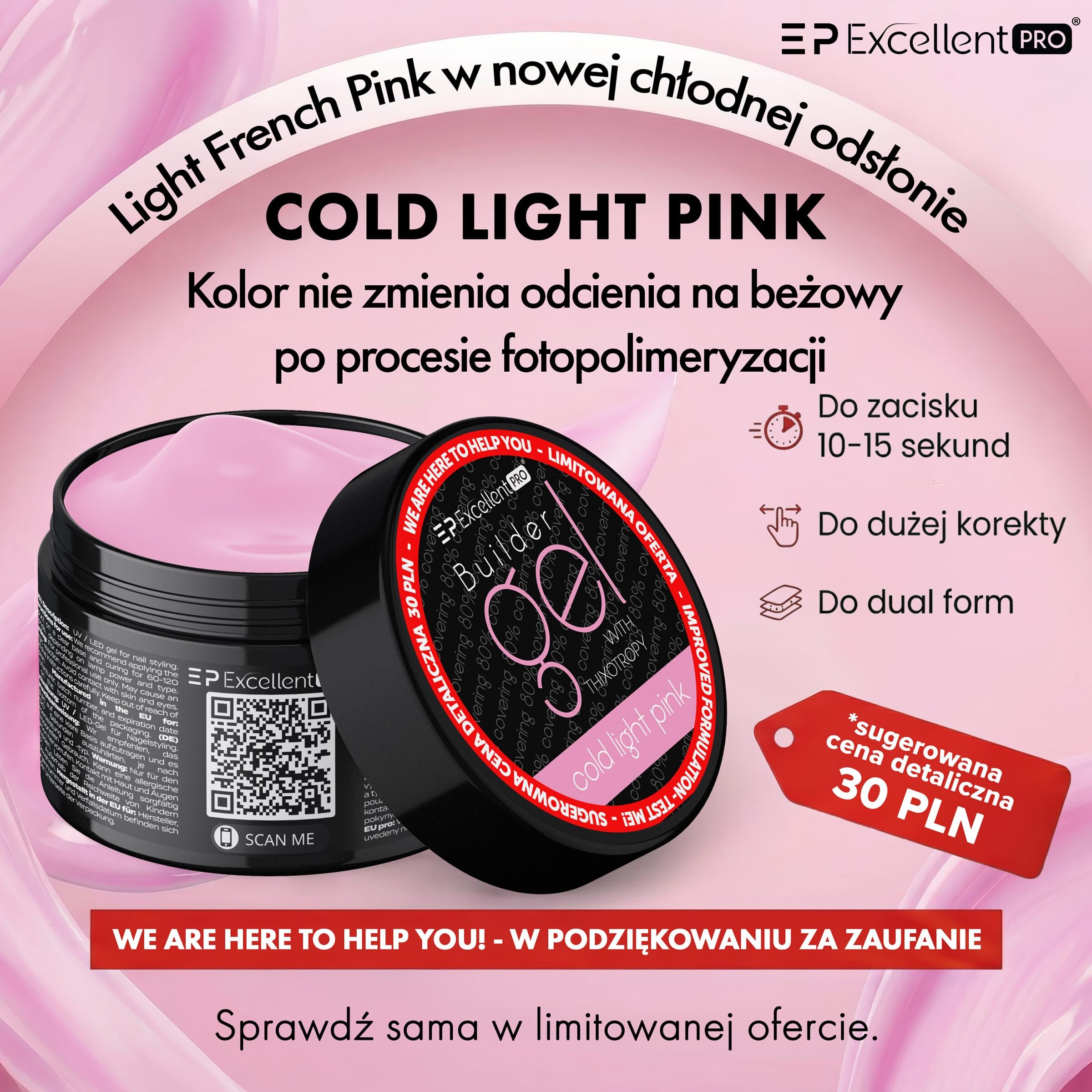 EXCELLENT PRO BUILDER GEL WITH THIXOTROPY COLD LIGHT PINK To kolejna odsłona kultowego żelu Builder Gel with Thixotropy Light French Pink, który będzie doskonały dla fanek bardziej chłodnego różu oraz twardszego produktu. Kolor nie zmienia odcienia na beżowy po procesie fotopolimeryzacji. Twardy żel, którym wykonasz krótkie, średnie, długie i bardzo długie przedłużenia na szablonie oraz tipsie. Świetnie sprawdzi się także w stylizacjach wykonywanych przy pomocy dual form. Dzięki „pamięci cieczy” praca żelem jest łatwa i przyjemna, ponieważ żel nie zalewa skórek, jednocześnie dobrze się poziomując. Żel ten będzie doskonałym wyborem dla wymagających stylistek, które wykonują spore korekty oraz używają w swojej pracy zaciskarki. Doskonały do zacisku po około 10/15 sekundach w zależności od mocy i rodzaju diód w lampie.